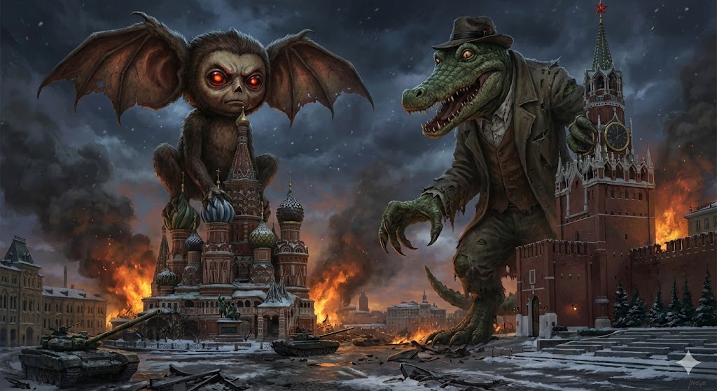 "...Крокодил, существо, в наших широтах не водящееся и в традиционной символике (вспомним Древний Египет) прочно ассоциирующееся с богом Сетом, богом зла, хаоса и пустыни, олицетворяющим губительную водную стихию. Второй — Чебурашка, демон Луны, существо, не имеющее аналогов среди живых, чистый симулякр."